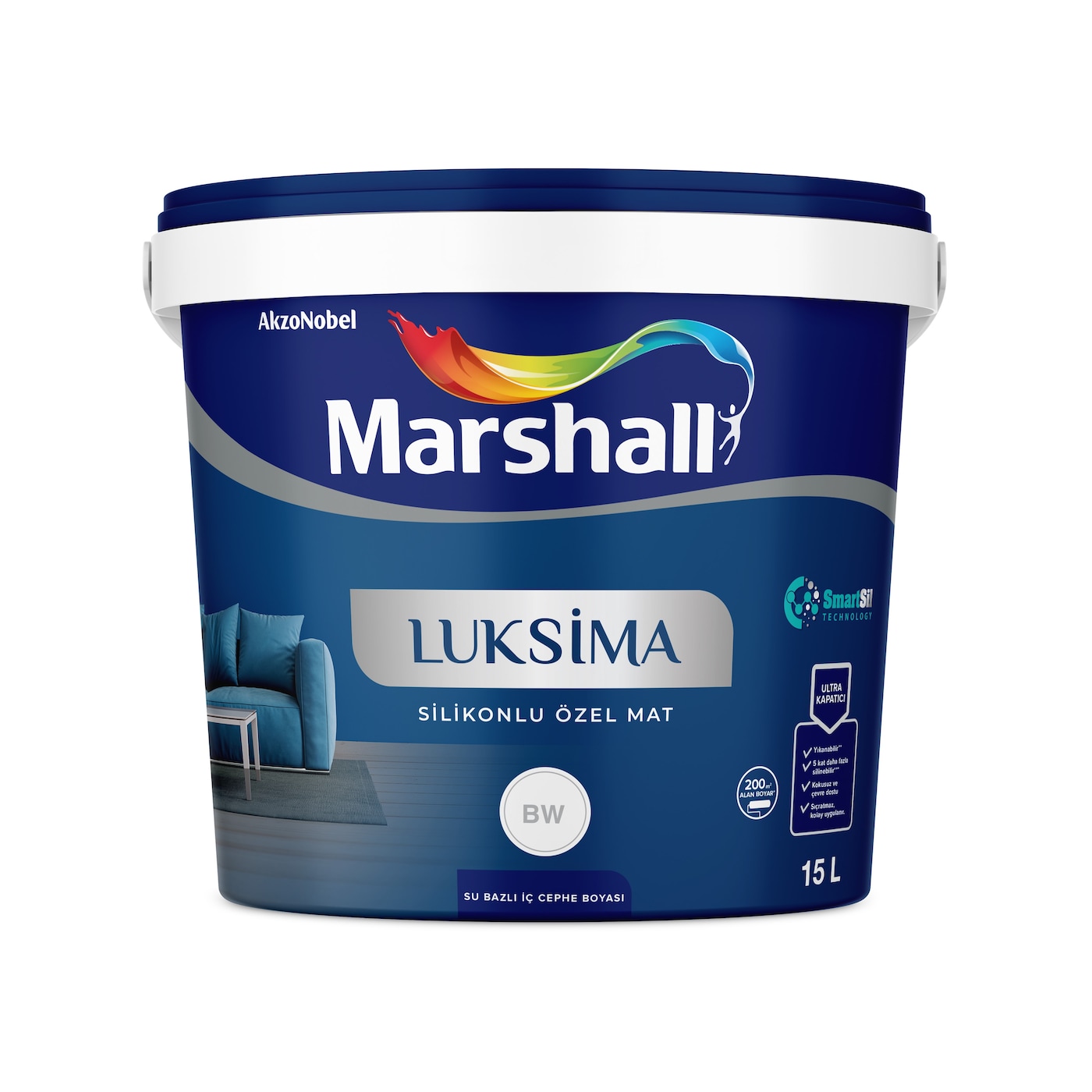 A paint with SmartSil technology — ultra-covering, odorless and eco-friendly. It covers up to 200 m², is spatter-free, easy to apply, washable, and 5 times more scrub-resistant.