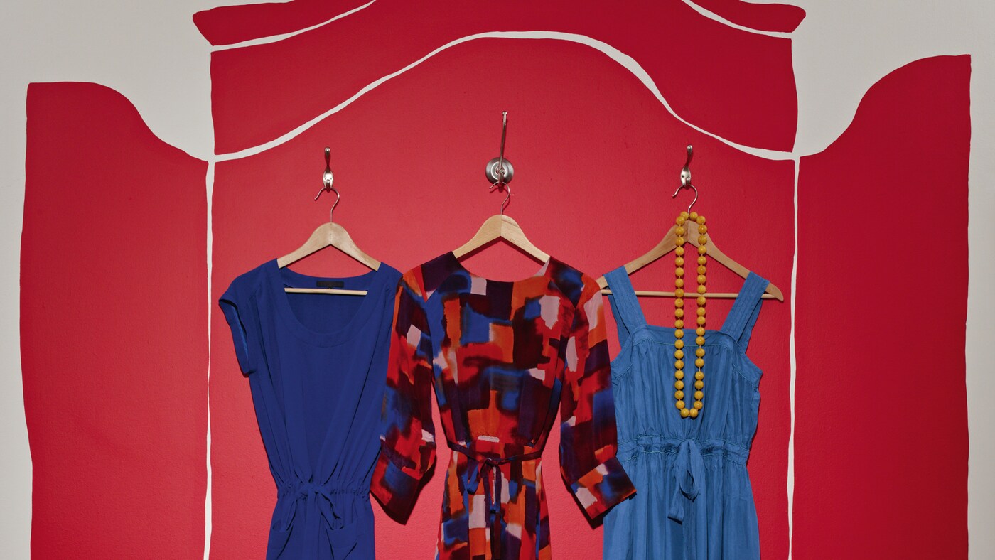 Askıdaki kıyafetlere bir arka plan yaratacak şekilde boyanmış, canlı kırmızı gardrop şeklindeki duvar resmi ile yatak odası eğlenceli bir dokunuş kazanıyor.